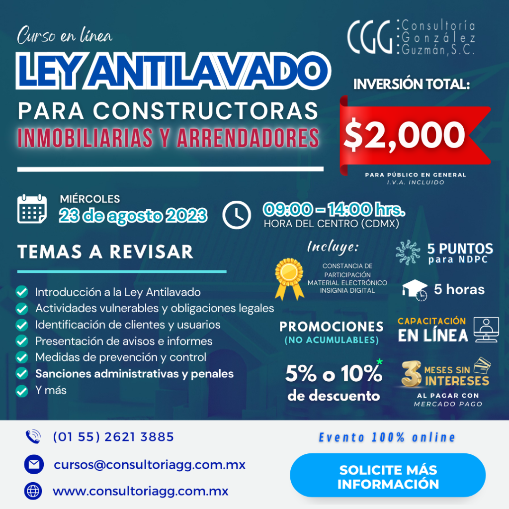 En este curso, tendrás la oportunidad de comprender en profundidad la Ley Antilavado y sus implicaciones específicas para constructoras, inmobiliarias y agencias de arrendamiento. Bajo la guía del experto en materia fiscal y contable, C.P.C. Froylán González Guzmán, podrás adquirir los conocimientos necesarios para cumplir con la normatividad y prevenir el lavado de dinero en tus operaciones. En un entorno empresarial cambiante, es esencial estar preparados para cumplir con las regulaciones en materia de prevención de lavado de dinero. Por eso, este curso está diseñado especialmente para empresarios, contadores, administradores y cualquier persona involucrada en organizaciones de la sociedad civil o empresas que realicen actividades vulnerables. Cursos capacitación fiscal contable.